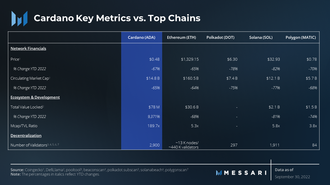ทุกเครือข่ายเริ่มมีความร้อนแรงขึ้นจากสถานการณ์ในตลาดหมี; Cardano ก็ไม่ต่างกับรายอื่ ๆ เป็นส่วนใหญ่ ด้วยขนาดของ market cap ที่ตกลง 65% ตลอดทั้งไตรมาสสามของปี 2022 ถึงแม้เช่นนั้น market cap และการกระจายศูนย์กลาง ยังคงขึ้นนำอยู่เหนือคู่แข่งส่วนใหญ่ อย่างไรก็ตามระบบนิเวศของ Cardano นั้นยังห่างไกลจากคู่แข่ง ถังแม้จะมีการเติบโตในปีนี้ เป้าหมายของ Cardano ในอนาคตอันใกล้จะต้องไล่ตามเพื่อสถาปนาระบบนิเวศ และแย่งชิงส่วนแบ่งการตลาดบ้าง